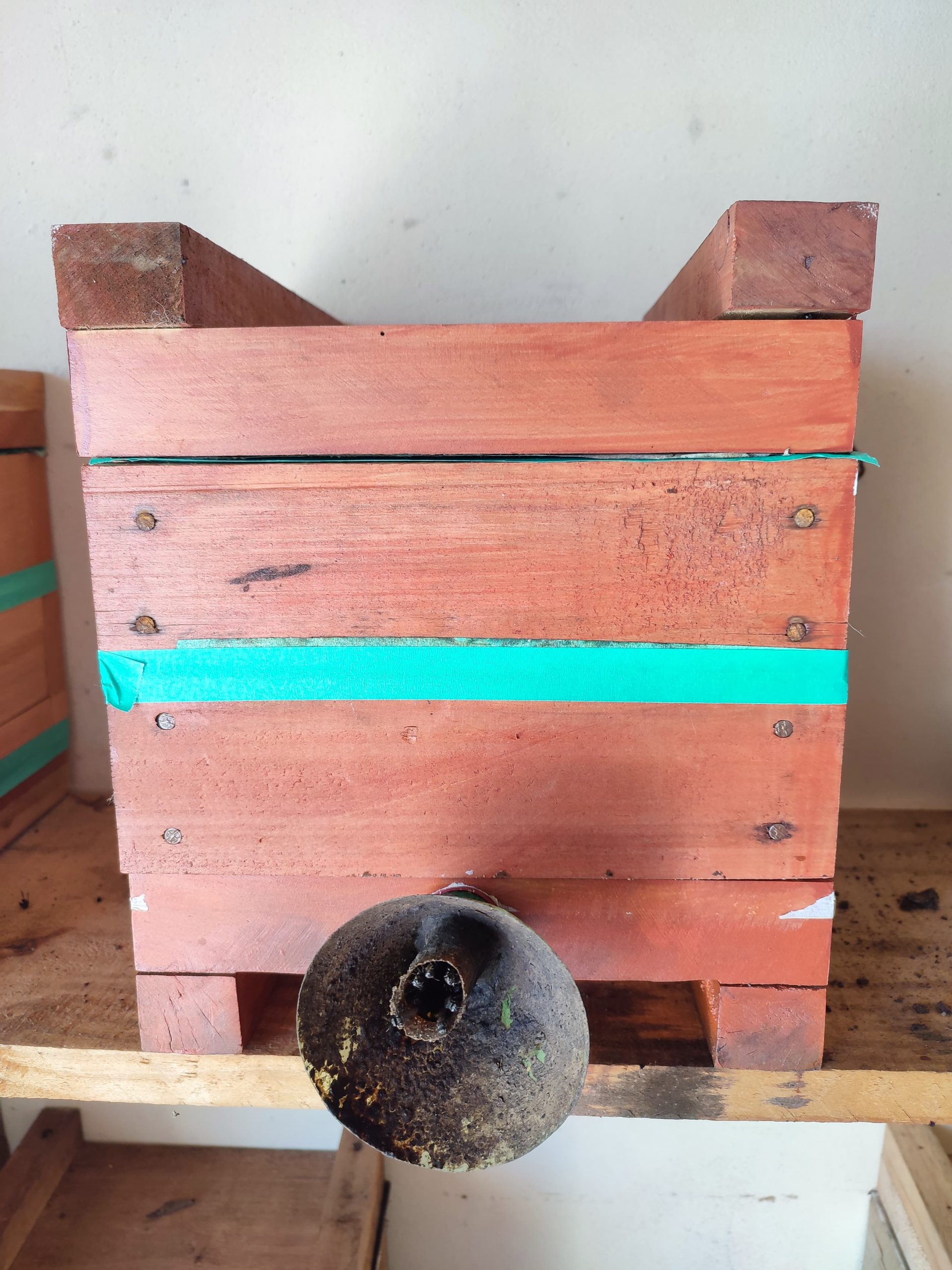 As colmeias são oriundas de captura em iscas, o que preserva uma genética rústica e favorece a adaptação da colônia. Utilizamos caixas padrão 18×18 ou 20×20, com espessura entre 3 cm e 3,5 cm, garantindo boa termorregulação e proteção contra variações climáticas.