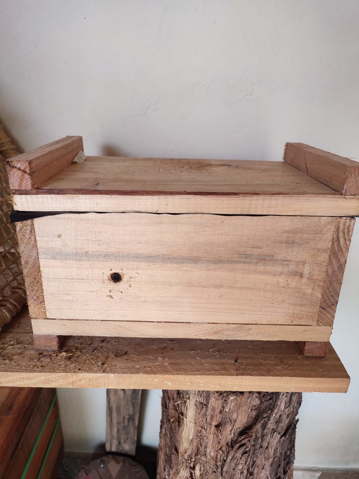 As colmeias seguem o padrão caixa baú, oferecendo ótima termorregulação e proteção contra variações climáticas, permitindo o desenvolvimento saudável do enxame.